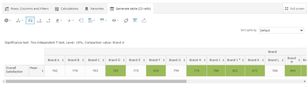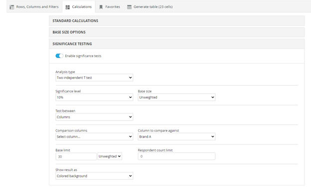 Significance testing can be applied to almost any run in the PowerSource Cross Table Tool to help users determine if differences in results are statistically significant. In order to add significance testing: