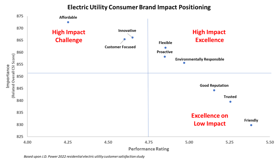 The brand positioning matrix below shows how positioning the utility as Affordable, Innovative, and Customer Focused produces the greatest impact on our Customer Satisfaction Index (CSI) scoring.